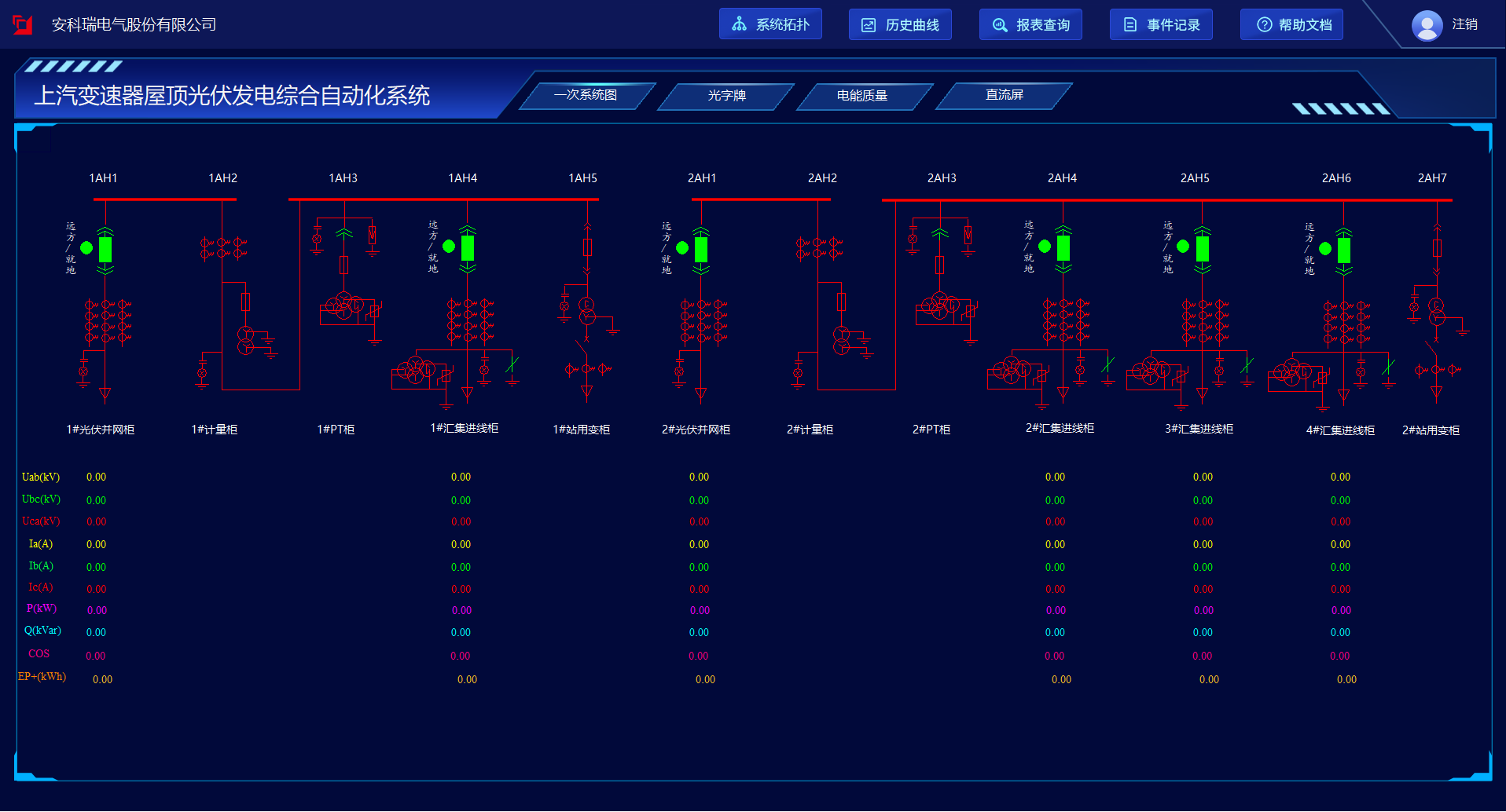 電能質(zhì)量在線監(jiān)測裝置采集#1、2#光伏并網(wǎng)接入點(diǎn)的電能質(zhì)量信息,可以對整個(gè)供電系統(tǒng)的電能質(zhì)量包括穩(wěn)態(tài)狀態(tài)和暫態(tài)狀態(tài)進(jìn)行持續(xù)監(jiān)測。系統(tǒng)界面實(shí)時(shí)顯示裝置通信狀態(tài)、各監(jiān)測點(diǎn)的A/B/C相電壓總畸變率、三相電壓不平衡度百分比和正序/負(fù)序/零序電壓值、三相電流不平衡度百分比和正序/負(fù)序/零序電流值,幫助管理人員實(shí)時(shí)掌握供電系統(tǒng)電能質(zhì)量情況,以便及時(shí)發(fā)現(xiàn)和消除供電不穩(wěn)定因素。