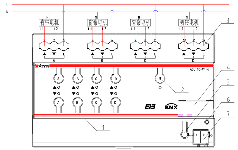 上圖為4路窗簾驅(qū)動器的接線示意圖。在實(shí)際項(xiàng)目使用中,2路窗簾驅(qū)動器的接線和4路模塊類似,在此就不一一列出。現(xiàn)對4路窗簾驅(qū)動器接線圖進(jìn)行說明。