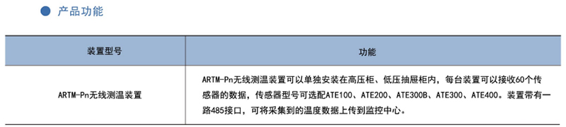 ARTM-Pn無(wú)線(xiàn)測(cè)溫裝置:ARTM-Pn無(wú)線(xiàn)測(cè)溫裝置可以單獨(dú)安裝在高壓柜、低壓抽屜柜內(nèi),每臺(tái)裝置可以接收18個(gè)傳感器的數(shù)據(jù),傳感器型號(hào)可選配ATE100、ATE200、ATE300。裝置帶有一路485接口,可將采集到的溫度數(shù)據(jù)上傳到監(jiān)控中心。