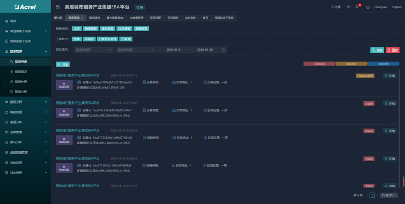 系統(tǒng)在產(chǎn)生報警或隱患后,系統(tǒng)可以針對工程人員派發(fā)工單,處理完以后工程人員能夠在系統(tǒng)中填寫相關(guān)工單任務(wù)記錄,以供歷史查詢。隱患統(tǒng)計支持對項目進行日、月、季、年的維度查詢,并能夠自定義時間查詢,將項目下隱患以曲線,圖表的形式展現(xiàn)。