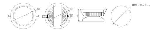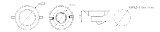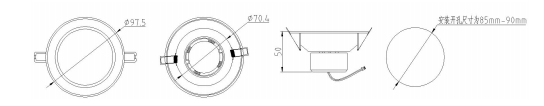 b.嵌頂式燈具安裝:在天花板上開好安裝孔位,相應(yīng)的燈具開孔尺寸為φ97.5mm(或 107.5),天花 板厚度為 1-20mm。將燈具上的彈簧按圖所示方向撐開到可以塞入安裝孔,保持彈簧張開狀態(tài),將燈具放入安裝孔,松開彈簧,此時彈簧復(fù)位,將燈具固定在天花板上,即完成安裝。