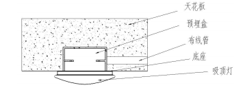 c.吸頂式燈具安裝:先將標準型 86 預(yù)埋盒安裝好;再固定安裝支架,安裝支架固定位置與預(yù)埋盒中心位置偏移 43mm。連接好總線及電源線;將安裝支架卡入燈具內(nèi),并擰上螺釘,即完成安裝.