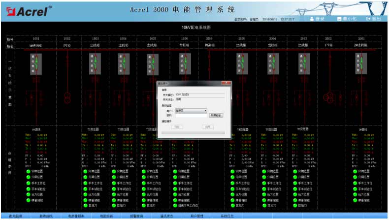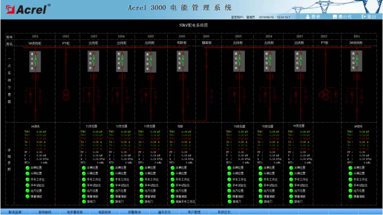系統(tǒng)人機(jī)界面友好,以配電一次圖的形式直觀顯示配電線路的運(yùn)行狀態(tài),實(shí)時監(jiān)測各回路電壓、電流、功率、功率因數(shù)、電能等電參數(shù)信息,動態(tài)監(jiān)視各配電回路斷路器、隔離開關(guān)、地刀等合、分狀態(tài),以及有關(guān)故障、告警等信號。