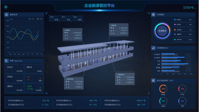 展示企業(yè)各類能耗總量、折標(biāo)值、能源成本、能源消耗趨勢、分項(xiàng)能耗占比、區(qū)域能源消耗對比,以及當(dāng)前天氣情況、污染情況,并三維展示企業(yè)重要工藝或工段的能源消耗動態(tài)。