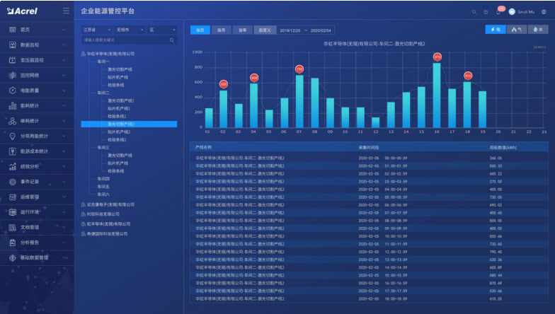 系統(tǒng)對區(qū)域、工段、設(shè)備能源消耗進(jìn)行數(shù)據(jù)采集,監(jiān)測重點(diǎn)設(shè)備及工藝運(yùn)行狀態(tài),如溫度、濕度、流量、壓力、速度等,并支持變配電系統(tǒng)一次運(yùn)行監(jiān)視。可直接從動態(tài)監(jiān)測平面圖快速瀏覽到所管理的能耗數(shù)據(jù),支持按能源種類、車間、工段、時(shí)間等維度查詢相關(guān)能源用量。