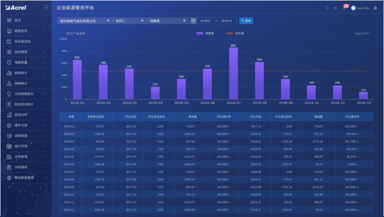 從能源使用種類、監(jiān)測區(qū)域、生產(chǎn)工藝/工段時(shí)間、分項(xiàng)等維度,采用曲線、餅圖、直方圖、累積圖、數(shù)字表等方式對企業(yè)用能統(tǒng)計(jì)、同比、環(huán)比分析、實(shí)績分析,折標(biāo)對比、單位產(chǎn)品能耗、單位產(chǎn)值能耗統(tǒng)計(jì),找出能源使用過程中的漏洞和不合理地方,從而調(diào)整能源分配策略,減少能源使用過程中的浪費(fèi)。