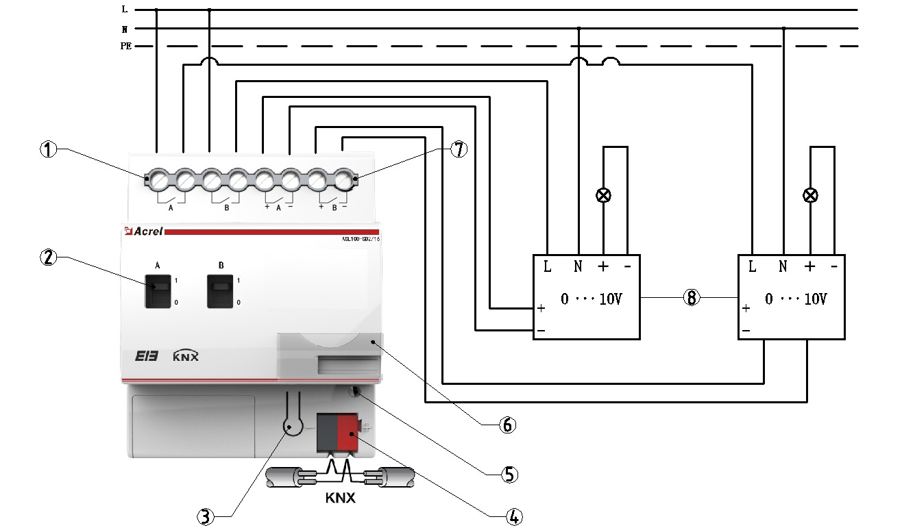 上圖2路0-10v調(diào)光驅(qū)動(dòng)器的接線示意圖。在實(shí)際使用中,4路0-10v調(diào)光驅(qū)動(dòng)器的接線方式和2路模塊類似,在此就不一一贅述,F(xiàn)對(duì)2路0-10v調(diào)光驅(qū)動(dòng)器的接線圖進(jìn)行說明。